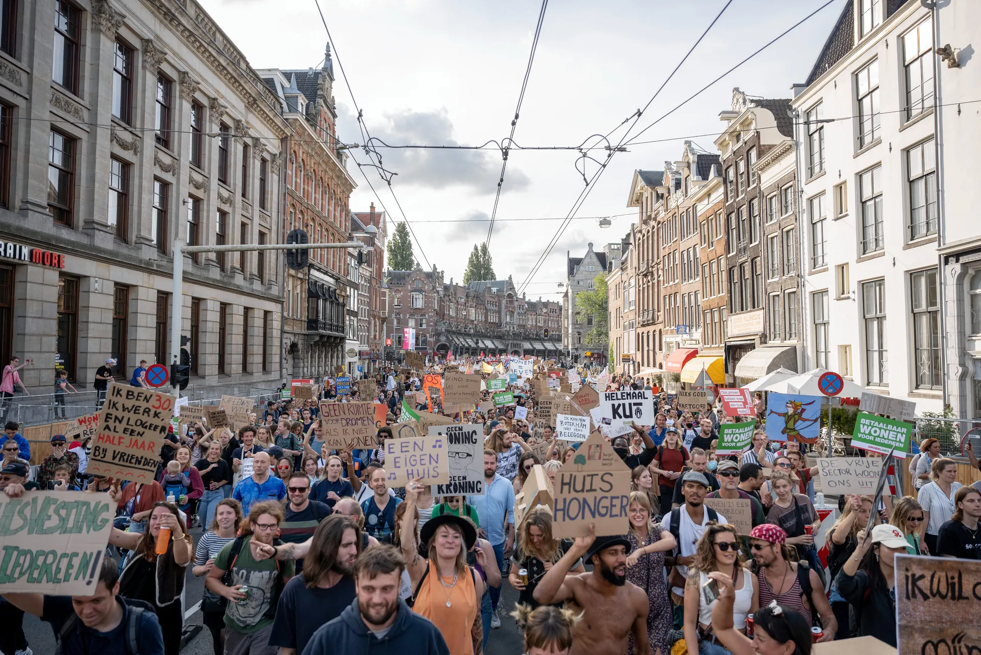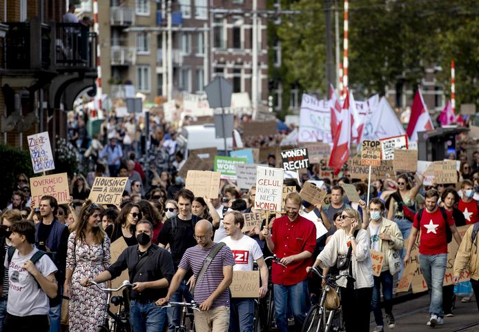 Protest op de Dam tegen woonbeleid aangekondigd. Honderdduizenden mensen staan op jarenlange wachtlijsten de huizenprijzen. AMSTERDAM ANP - De duizenden mensen die zich verzameld hebben voor het woonprotest zijn om 1615 uur richting de Dam vertrokken vanaf het Westerpark in Amsterdam.